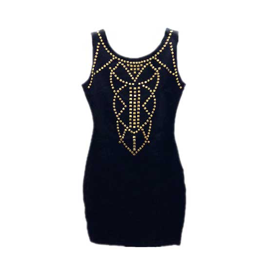 This ladies’ black-toned dress features golden toned metallic decorations arranged in a geometric shape at the front. The well-tailored bodice shows your alluring figure easily. This sleeveless dress makes an ideal choice for modern ladies.