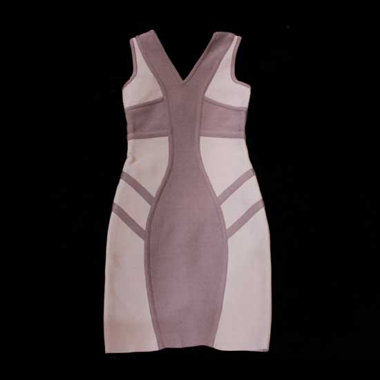 This ladies' sleeveless dress features a two-toned design. The flattering dress features a V neck and slim waistline. The tasteful dress is a great addition to any lady's wardrobe.