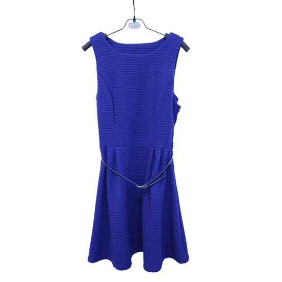 This is a sleeveless ladies' dress with an elegant design in allover blue. It is decorated with a waist belt for added style. The slim cutting showcases the perfect female figure.