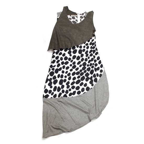 This ladies' one-piece dress features a patched design with chic dot printings in the middle. It is made of cotton and silk for maximum coziness. The asymmetric hem with rounded details exudes an attractive touch.
