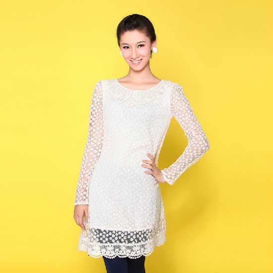 Displayed is a ladies' dress that comes in a neat white color. Featuring semi-transparent embroidered patterns, this long-sleeved dress is elegant and shows of good taste. This dress has a hip length white tank inside.
