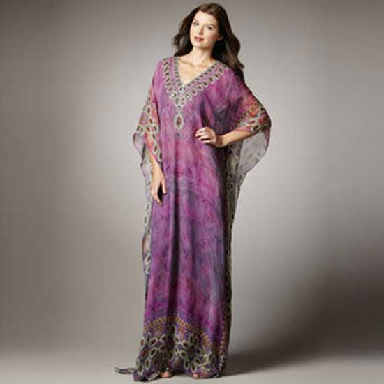 This ladies' V-neck dress comes with purple prints with oval details on the neck, cuffs and hem. It adopts a quality material to make you feel relaxed and comfortable. This long dress is ideal for casual occasions.