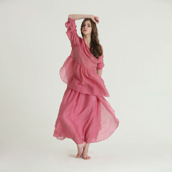 This is a long-sleeved ladies' dress in a lovely pink color. In two pieces, this loose-fitting dress is breathable and comfortable. This casual ladies' dress is dyed with natural pigments.