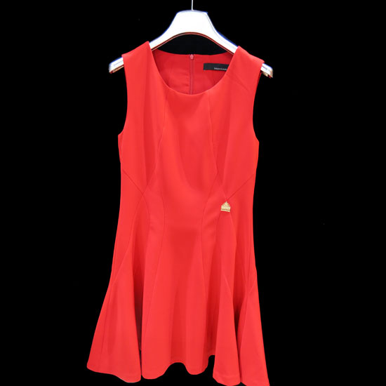 This is a ladies' dress that comes in an eye-catching red color. With a round neckline, this sleeveless dress features a beautiful flared skirt. This dress is made of polyester for lightness and easy washing.