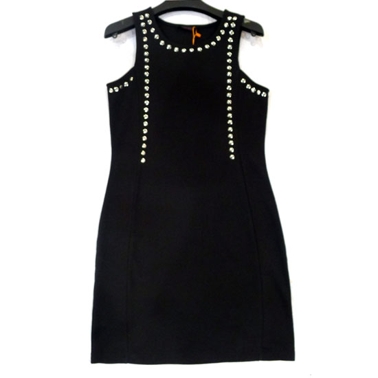 This stylish black dress comes with a sleeveless design and a round neckline. It is designed with dazzling ornaments on the front for an eye-catching look. This well-designed dress is a great choice for ladies.