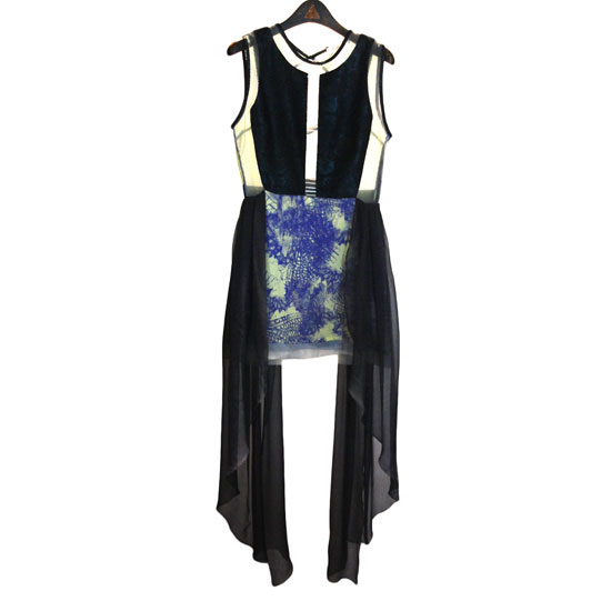 This is a slim-cut dress with see-through bodice tapes and a contrasting floral bottom. The dress is accentuated with silk drape details on the side. This taped dress is trendy and looks perfect with a pair of leather or suede Chelsea boots and a denim jacket.
