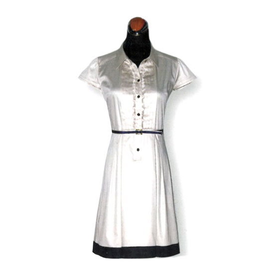 This ladies' dress features a silvery matt finish. It is accented with a black waistband for a neat look. Made of top grade fabric, this dress brings you ultimate wearing comfort.