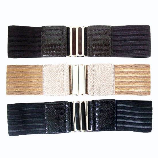 This is a fabulous wide elastic belt featuring sophisticated stripe patterns. The polished silvery buckle adds interest to this simple belt and the snake-like texture gives a contrasting accent. It will define your silhouette and complete your look in style.