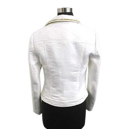 This is a short-style embossed jacket designed in allover white. The golden zips and sequin details highlight this jacket in a trendy way. This stylish jacket surely is an ideal addition to ladies' fashionable wardrobe.