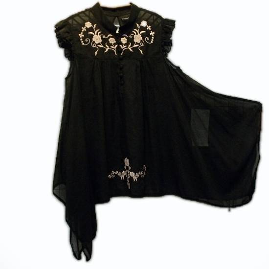 This lovely blouse features a button-down front and see-through pleats along the shoulders. It is adorned with embroidery along the V-neckline and asymmetrical bottom hem. The ruffled short-sleeve blouse has a texture that gives a soft and feminine touch.