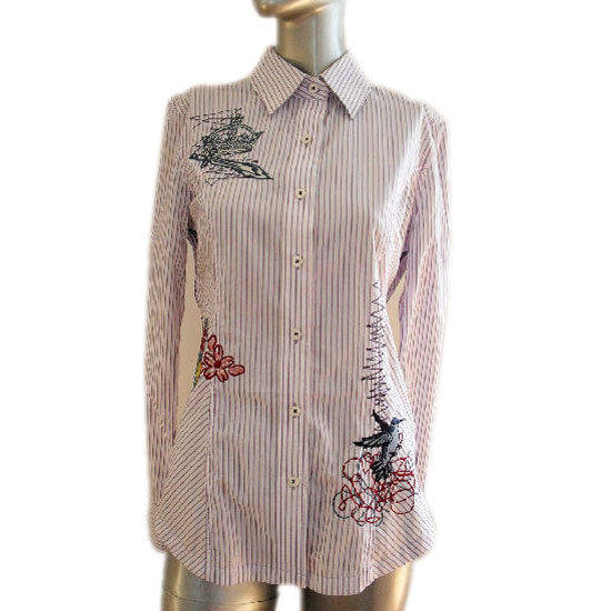 Displayed here is a ladies’ blouse in a beautiful red striped pattern. The vivid-colored embroidery spices up the entire appearance with a touch of uniqueness. The gorgeous shirt is finished with a button closure.