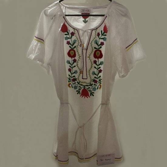 The U-neck blouse features a round neck and decorative floral vine embroidery. The drawstring at the waist promises an adjustable fit. The exquisite stitching and slightly scalloped hem add a hint of sophistication. This chic ladies' top spices up your casual wardrobe with style.