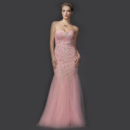 This is a ladies’ evening dress that features a classic tube type. The allover shimmering beads are well laid on the bodice. This fashionable evening dress is finished with a sweet heart neckline and a pleated skirt.