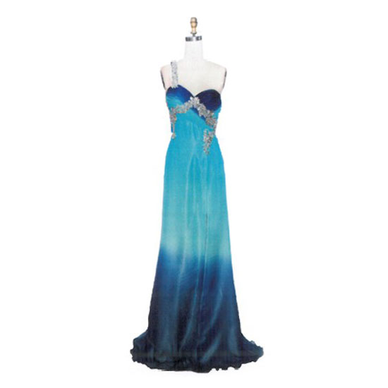 This evening gown with a single strap and sweetheart neckline can lend you a graceful and feminine air. The soft dress drapes loosely to the floor for incredible elegance. The transforming dark and light blue colors help to create the most wondrous sight.