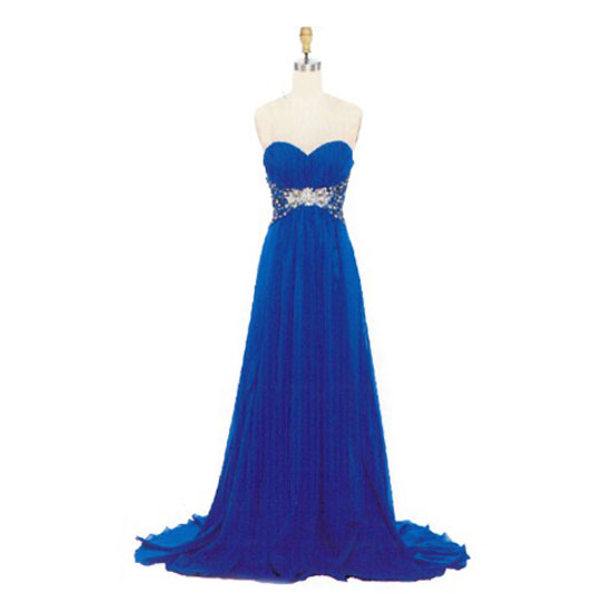 This bright blue evening gown can turn you into an ocean nymph. The strapless design with a sweetheart neckline is truly flattering. This brilliant dress is ideal for proms, balls, cocktail parties and more.