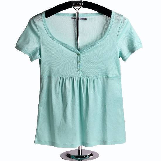 The short-sleeved top features a lovely heart-shaped neckline with a three-button front placket. The upper part is finely knitted with lightweight material to showcase a lady's perfect figure. The plain-patterned top in turquoise looks extremely grace and it is easy to match with any casual pants or skirts.