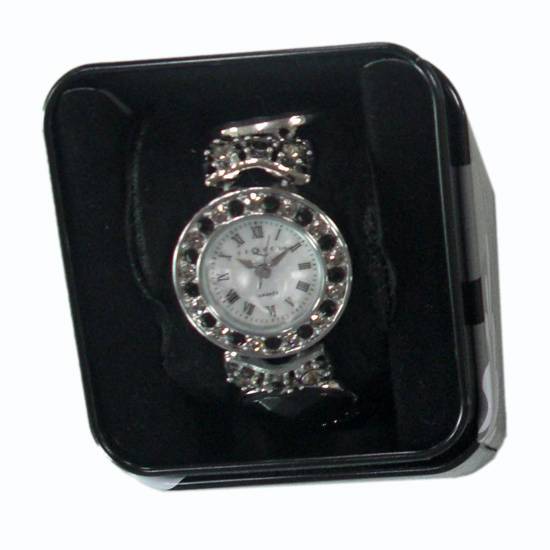 Featured is a stunning fashion watch with decorative black jewels on the bezel. It comes with Roman numeral indexes and a classic three-handed dial. The glittering finish simply makes it an excellent choice for ladies looking to brighten up an enchanting evening.