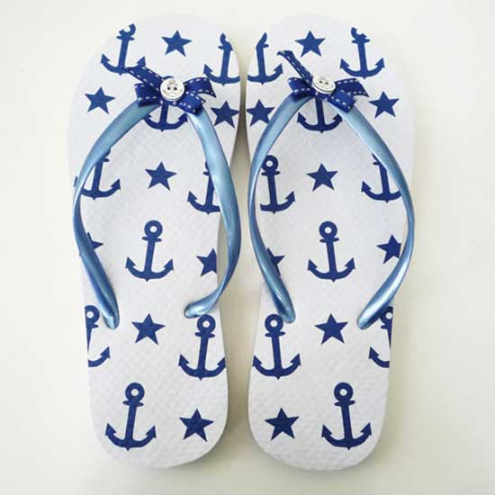 The featured flip flops are what you must have this summer. They have a beautiful design with anchor and star patterns on the footbeds. The straps come with pearlized finish and are decorated by a bow.
