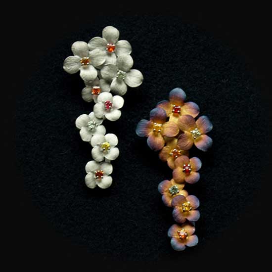 These earrings are formed by grouping several silver flowers together. The silver flowers are crafted delicately, making them look real and vivid. Colored stones are used to make the buds of the flowers. These elegant earrings go well with your daily outfits.