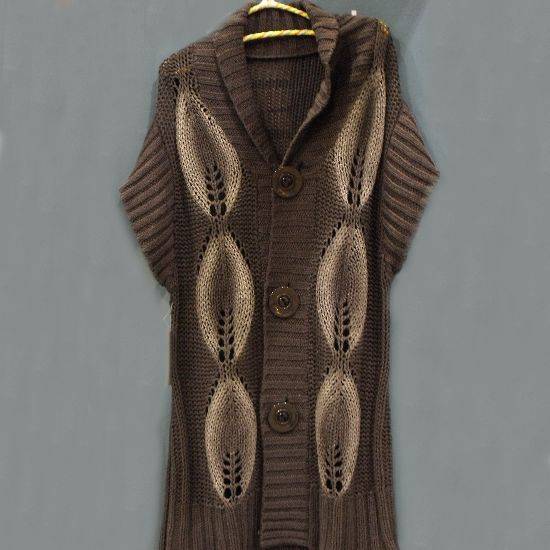 This long cardigan features large olive-shaped hand-crocheted detailing on the front for a dramatic look. The oversize button closure and the extra wide ribbed hems and cuffs give out a stylish touch. The V-neck turnover collar provides extra warmth for the neck in the cool days.