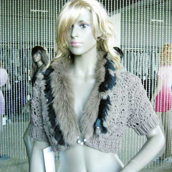This sweater is designed with a short cut and middle sleeves. The sweater is fully hand-crocheted with brilliant craftsmanship. The beautiful crocheted sweater is embellished by fur along the placket.