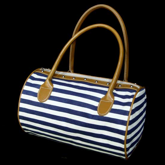 The ladies' handbag bestows stylish navy striped patterns for chic styling. The brown trimmings and stud details offer a touch of uniqueness and added style. This classy ladies' handbag is the perfect bag to welcome the coming spring.