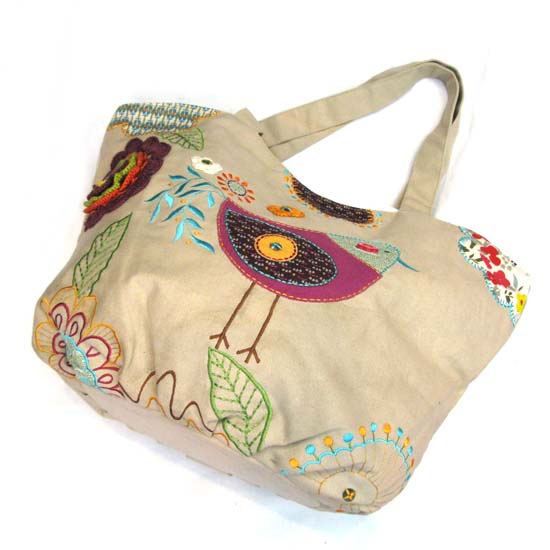 As shown is a ladies' handbag which is skillfully weaved with cotton and fabric. The light brown background is stitched and embroidered with the engaging flower, leaf, vine and bird patterns. This handbag makes a great match to any of your casual and juvenile outfits.