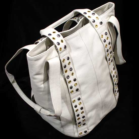 The handbag here is designed for two-way wearing. The bag is made of genuine cow leather dyed in bright white. Metal studs are added on the straps to express a chic style.