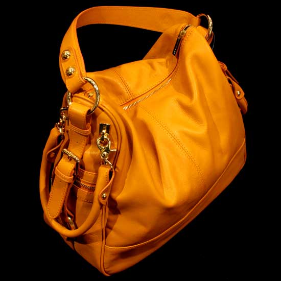 Highlighted is a beautiful handbag designed for two-way use. The genuine cow leather shell looks fabulous in a sharp orange color. Straps and buckles are added on two sides for added style.