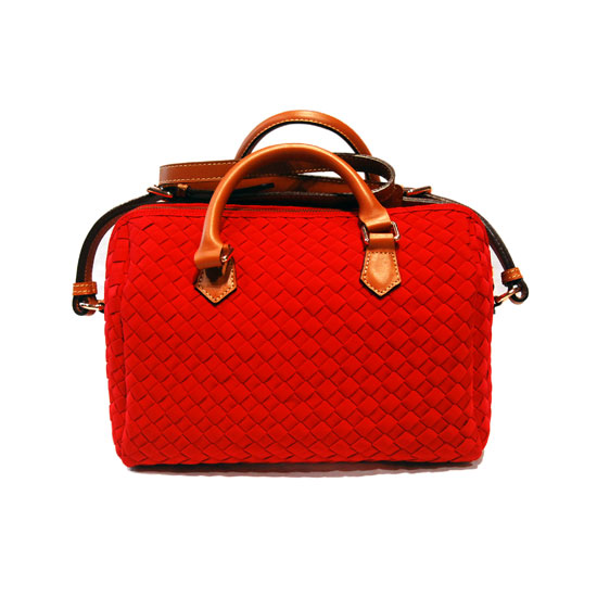 This is a ladies' handbag with a fashionable and chic design. It is meticulously crafted of polyester straps in bright red. The red brown leather hands and strap complete this design for a perfect finish.