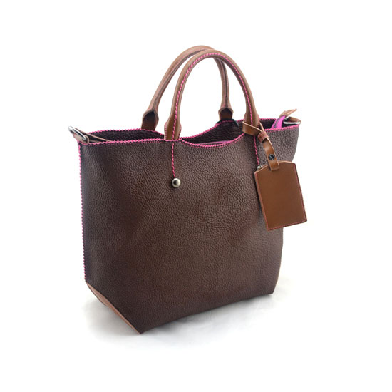 This is a handbag designed in dark brown with a textured finish. It features durable handles and an attached bag tag for added utility. The bright pink stitches accent this bag for a touch of uniqueness.