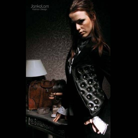 This stylish long-sleeve jacket features a stud-trimmed leather front. The contrasting fusion of glossy leather-liked and subtle matte material creates an especially glamorous look. It is a great to complete your ensemble with this one-of-a-kind jacket.