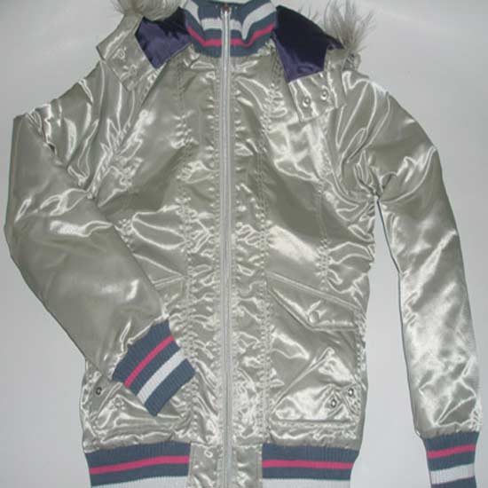 As shown here is a fashionable jacket for ladies. This beautiful jacket looks eye-catching with the glossy silver shell. The collar, sleeves and hem are adorned with striped bands for extra style.