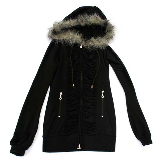 This is a ladies' jacket with a subtle yet fashionable design. The stylish jacket comes with a slim and hip-length cut. It is plain black in color with imitation fur trimming on the hood.