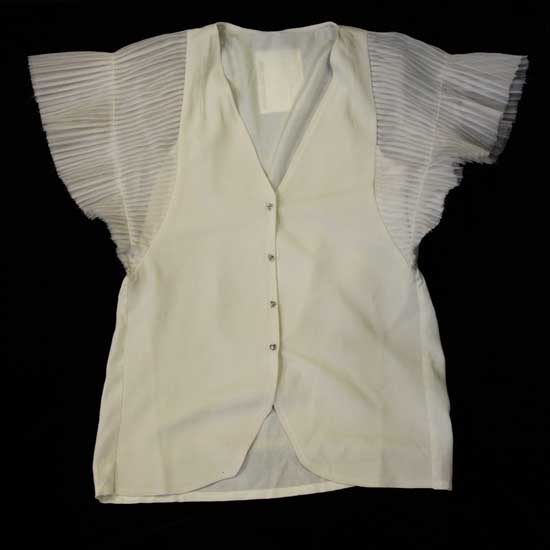 This ladies' jacket comes with a pair of pleated sleeves. The V-neck design boasts a smart look. The front features delicate glossy buttons. This jacket simply raises a lady's glamor.