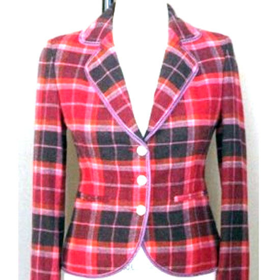 Shown here is a ladies’ jacket coming with a nice slim cut. The woolen tweed shell showcases traditional red and black checked patterns. The pink trimmings along the placket add extra beauty to the design.