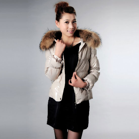 This ladies short jacket features a water-repellent and glossy exterior with front zip closure. The fox fur collar adds a luxurious touch to this elegant jacket. It matches perfectly with a thigh-length dress or a pair of jeans.