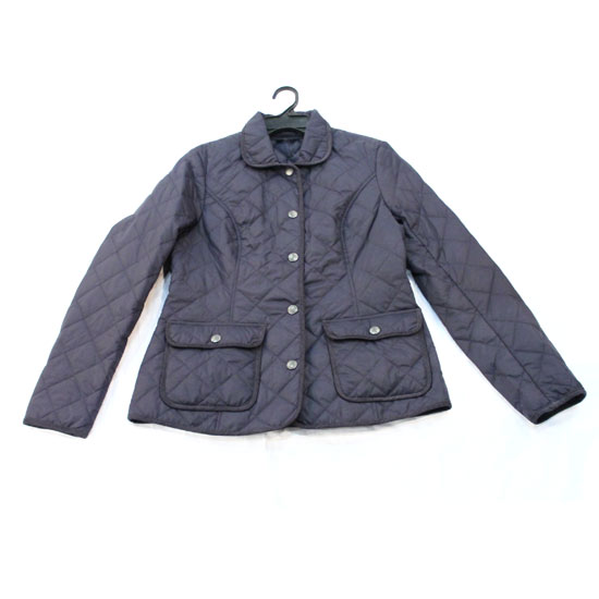 This gray ladies’ jacket features a padded pattern for a touch of uniqueness. The front is designed with two buttoned pockets for added functionality. Made of nylon, this stylish outerwear bestows optimum wearing comfort.