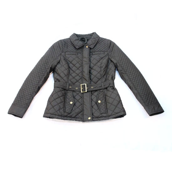 This gray ladies’ jacket features a padded pattern for a chic touch. The front is designed with two vertical buttoned pockets and a buckled belt for added appeal. Made of cotton, this stylish outerwear bestows blissful warmth.