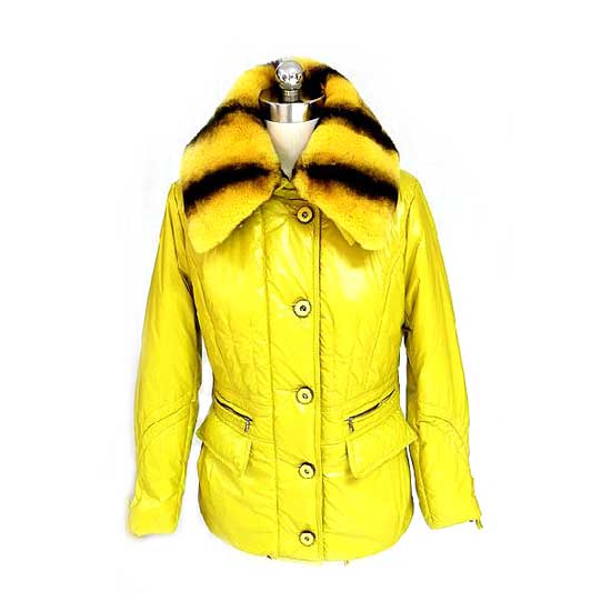 The bright yellow down jacket will surely make a bold statement in the wintry days. It is designed with a yellow-and-black toned fur collar for a funky yet cozy look. This bold yellow down jacket is a great piece for women, who love stealing spotlight from the crowd.