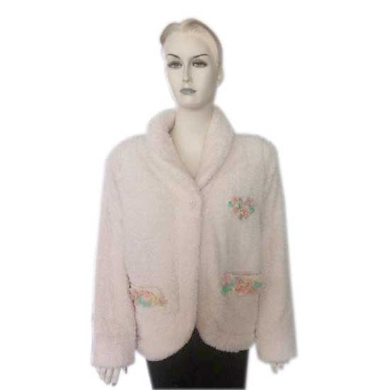 This is a ladies' jacket in pink with exquisite decorations for added elegance. It is made of soft plush fabric to ensure enhanced comfort and warmth. This beautiful jacket surely is an excellent addition to your winter wardrobe.