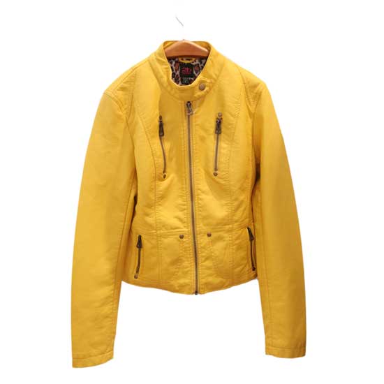 This ladies' PU leather jacket features a bright yellow color. The fashionable jacket features a stand collar and four zippered pockets. This chic PU leather jacket is perfect to show your unique personality.