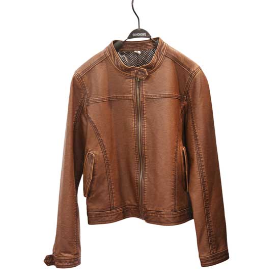 This chic ladies' jacket feature brown PU leather construction. The functional jacket features a zippered front and two flap pockets. The top-quality PU jacket is finely made with great attention to details.