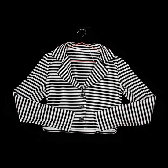 This fashionable jacket is accented with black and white stripe patterns. The trendy jacket features a notched collar and a cropped design. The three-button front completes look of this piece.