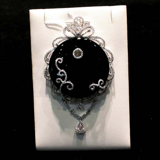 This beautiful pendant features a black jade in a round shape. The jade is embraced with sparkling diamonds to enhance its glamour. This exquisite pendant is perfect for ladies who pursue a sophisticated style.