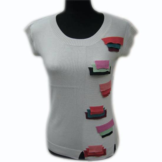 This white ladies' blouse has a special texture, making this fashion item unique. There are colorful fabric pieces attached on the left of the blouse, serving as an eye-catching touch. This ladies' blouse is comfortable to wear with the breathable texture.