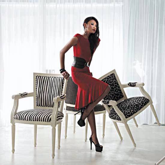 The ladies' jersey dress features padded-shoulder styling with a flare skirt. The red dress is accented by a black waist belt for added style. This red open-back jersey dress will suit any special occasion.
