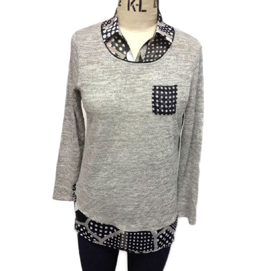 This is a ladies’ jersey top that is soft and comfortable to the touch. The small dot patterns add a touch of style to the whole piece. This fashionable top is finished with a classic collar and long sleeves.