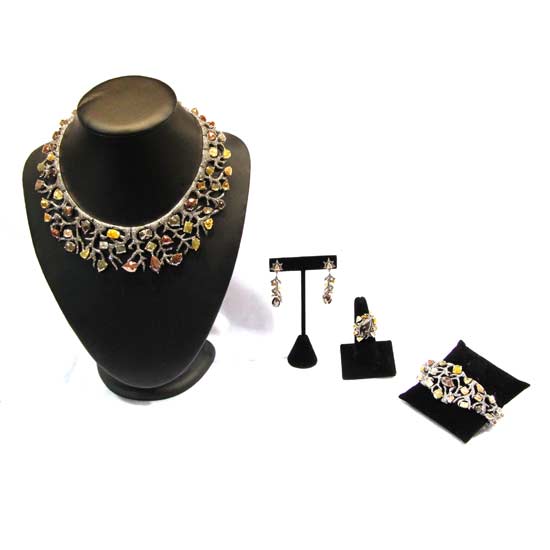 The ladies' jewelry set includes a necklace, a ring, a bracelet and a pair of earrings. Each item features an 18K white gold frame set with diamonds in assorted colors. This jewelry set makes an elegant way to enhance your grand ensemble.