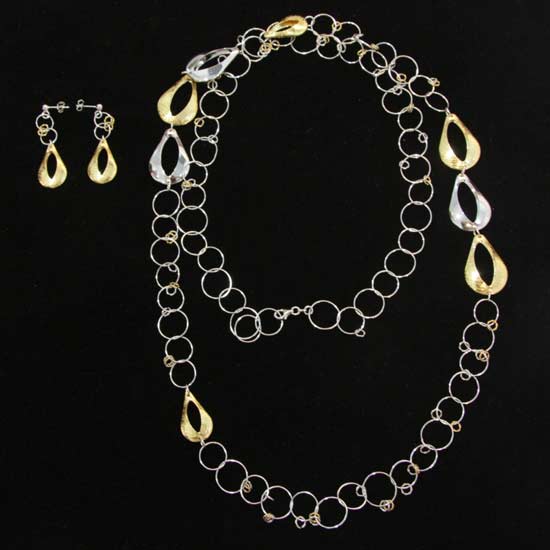 This 2-piece jewelry set includes a necklace and a pair of earrings, featuring circular interlocking links. The eye-catching golden and silvery accents add extra allure to these fine jewelry pieces. The rhodium-plated finish promotes excellent corrosion resistance.